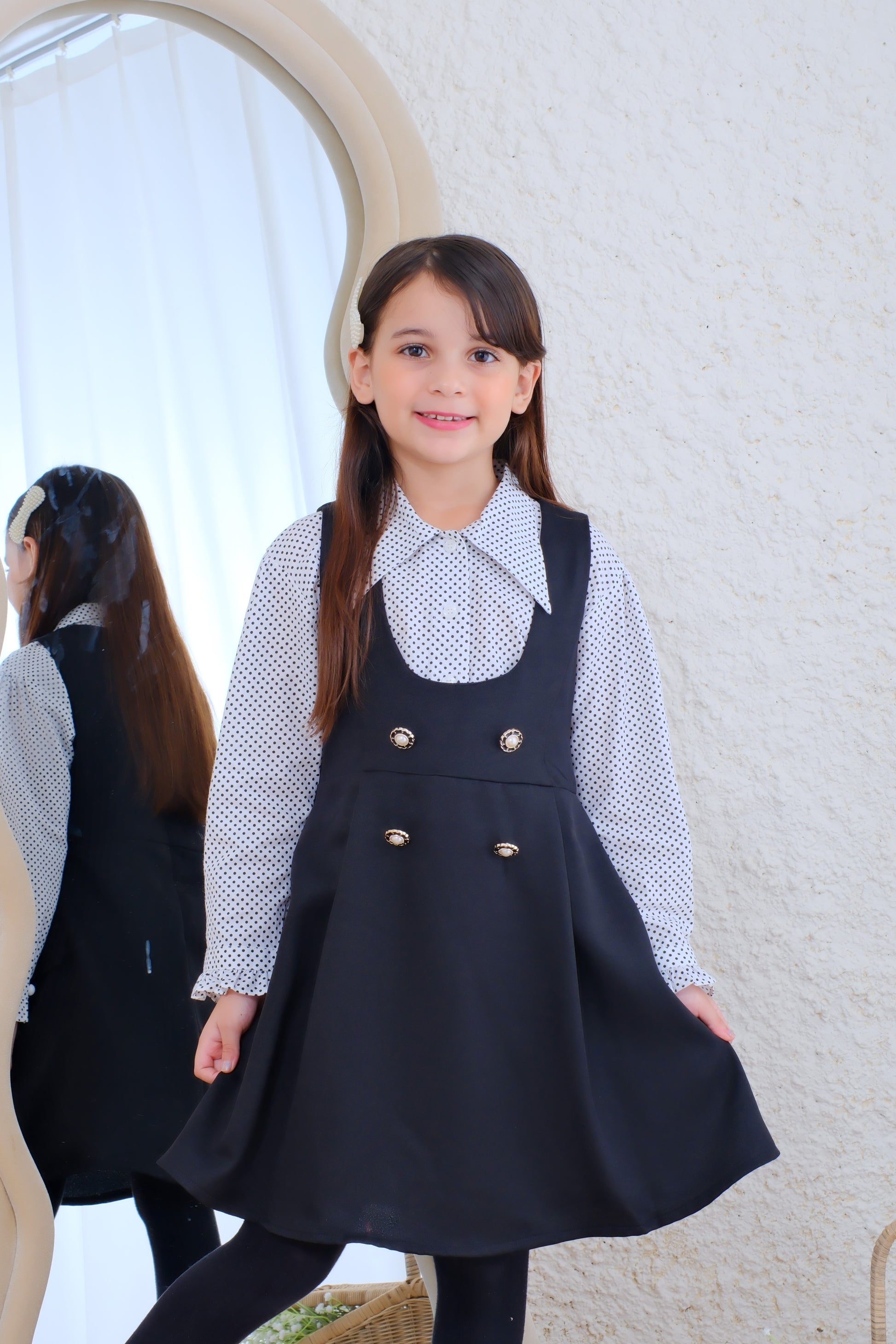 - terdiri dari kemeja putih polkadots berbahan katun dan outer berbahan poly crepe black