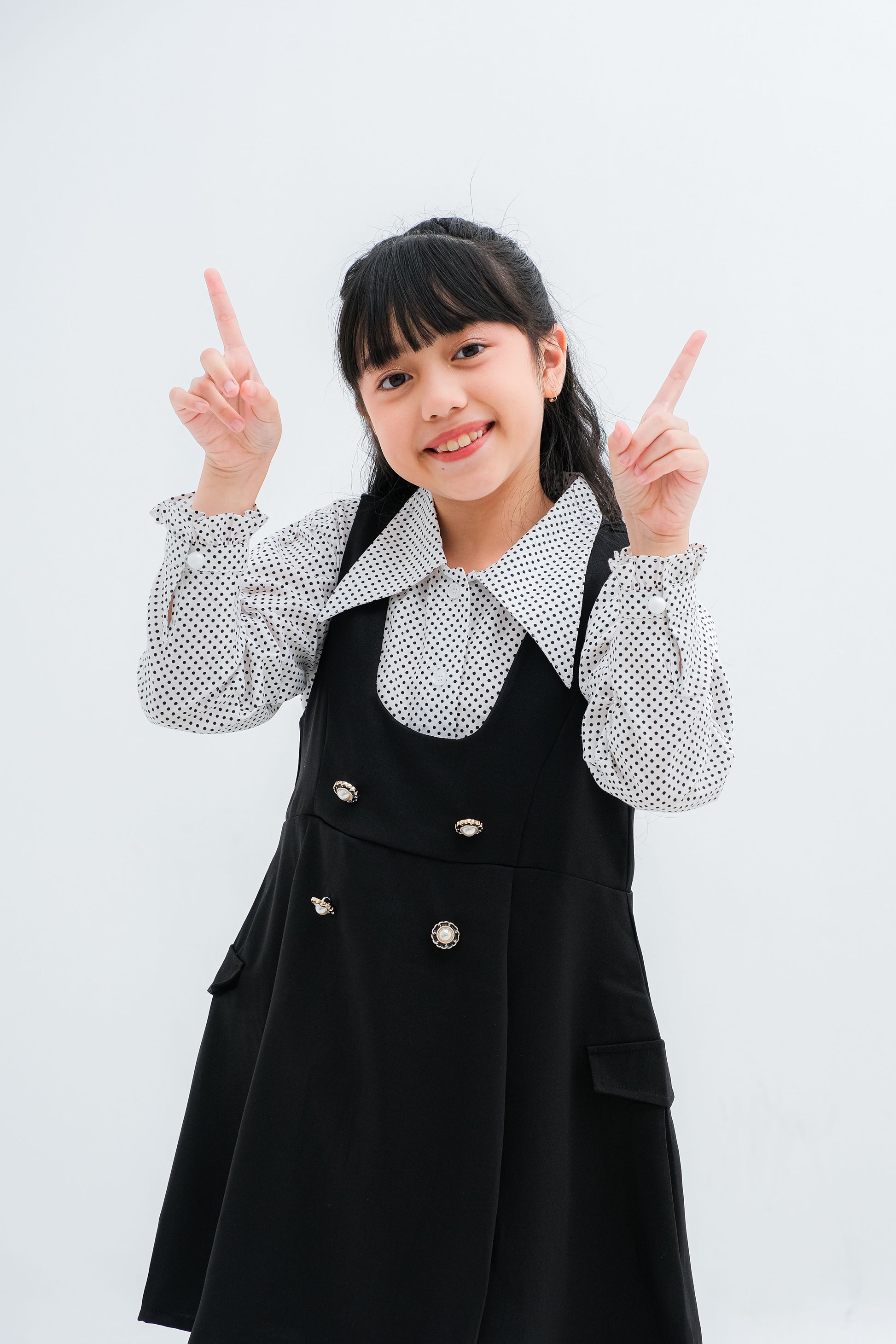- terdiri dari kemeja putih polkadots berbahan katun dan outer berbahan poly crepe black