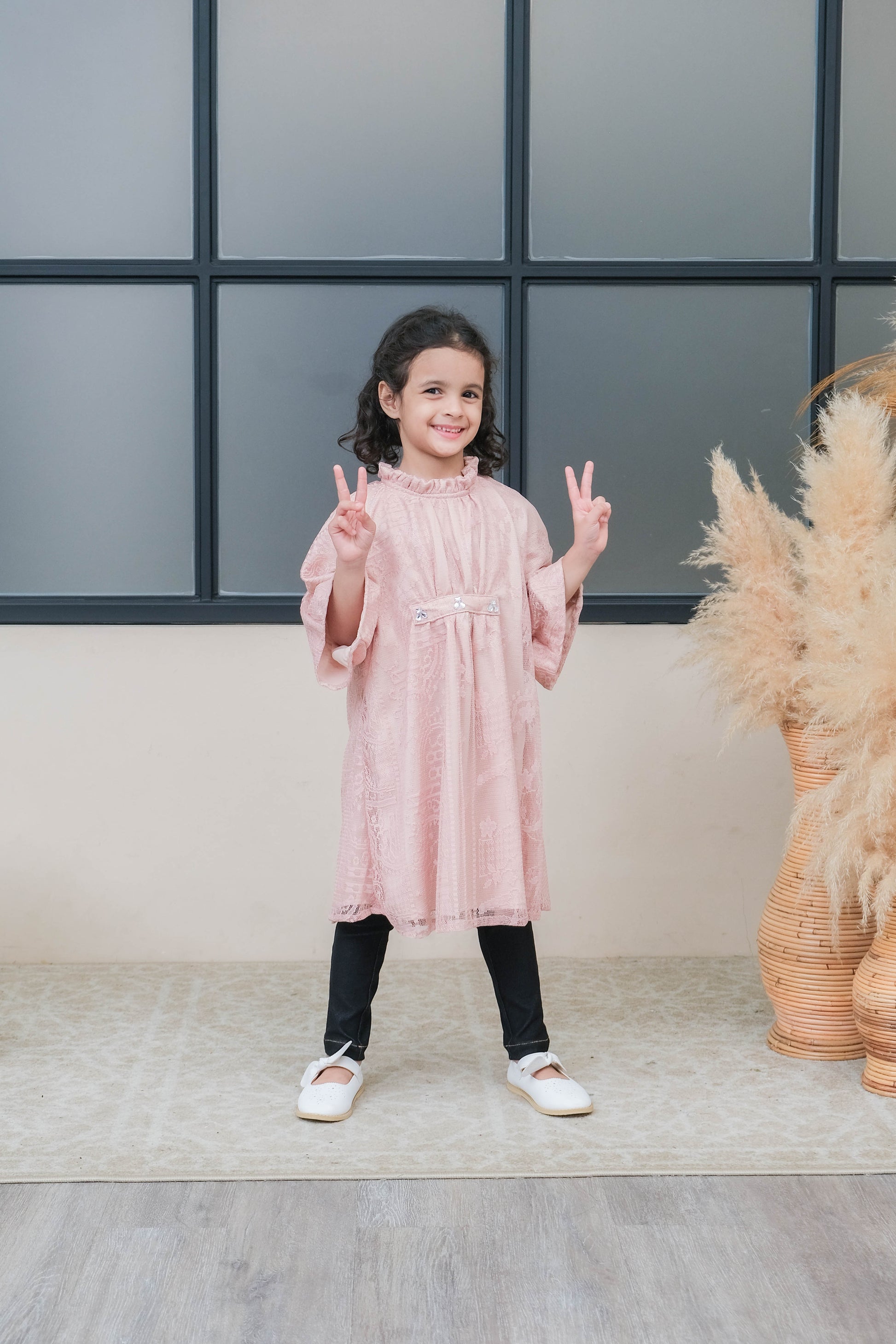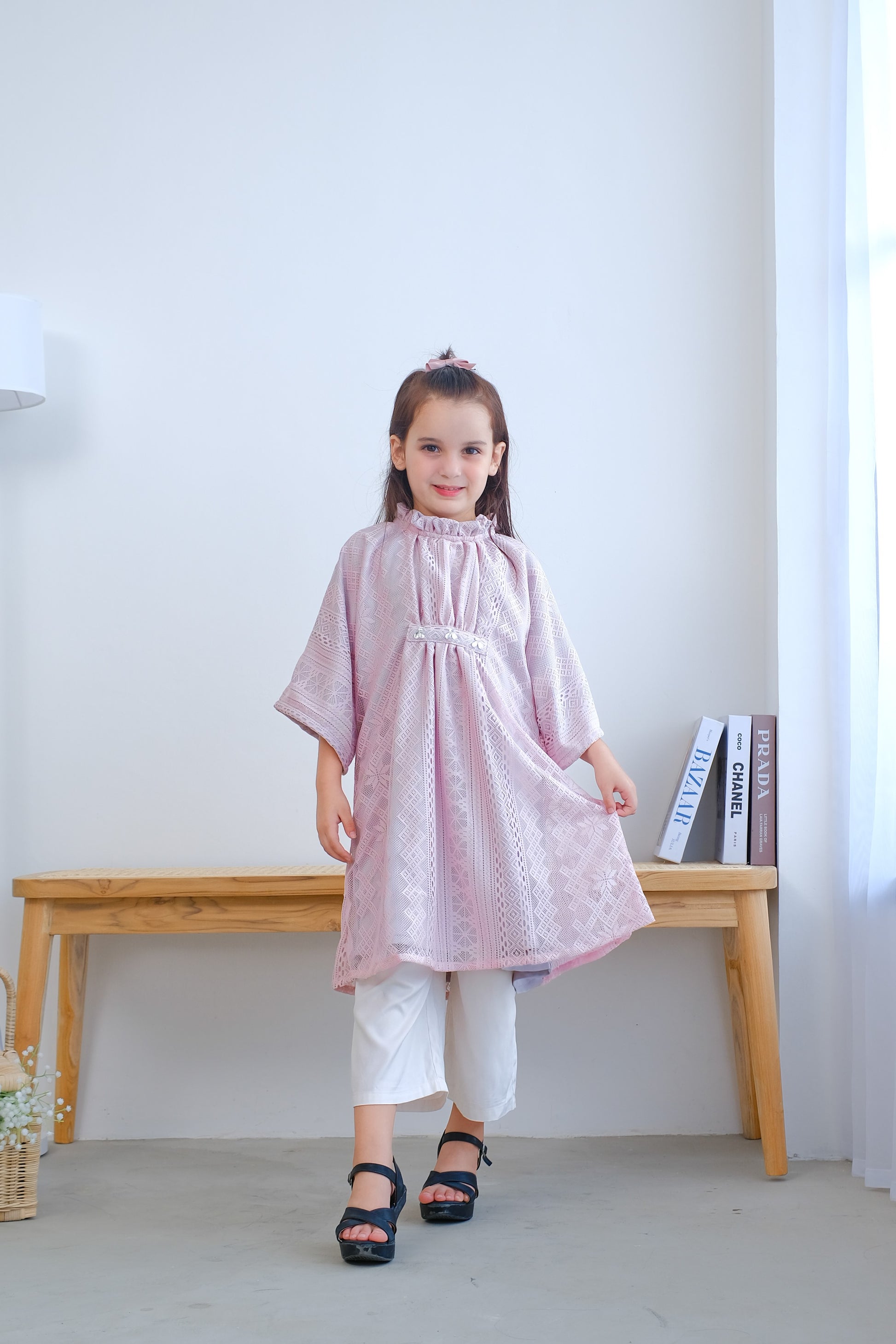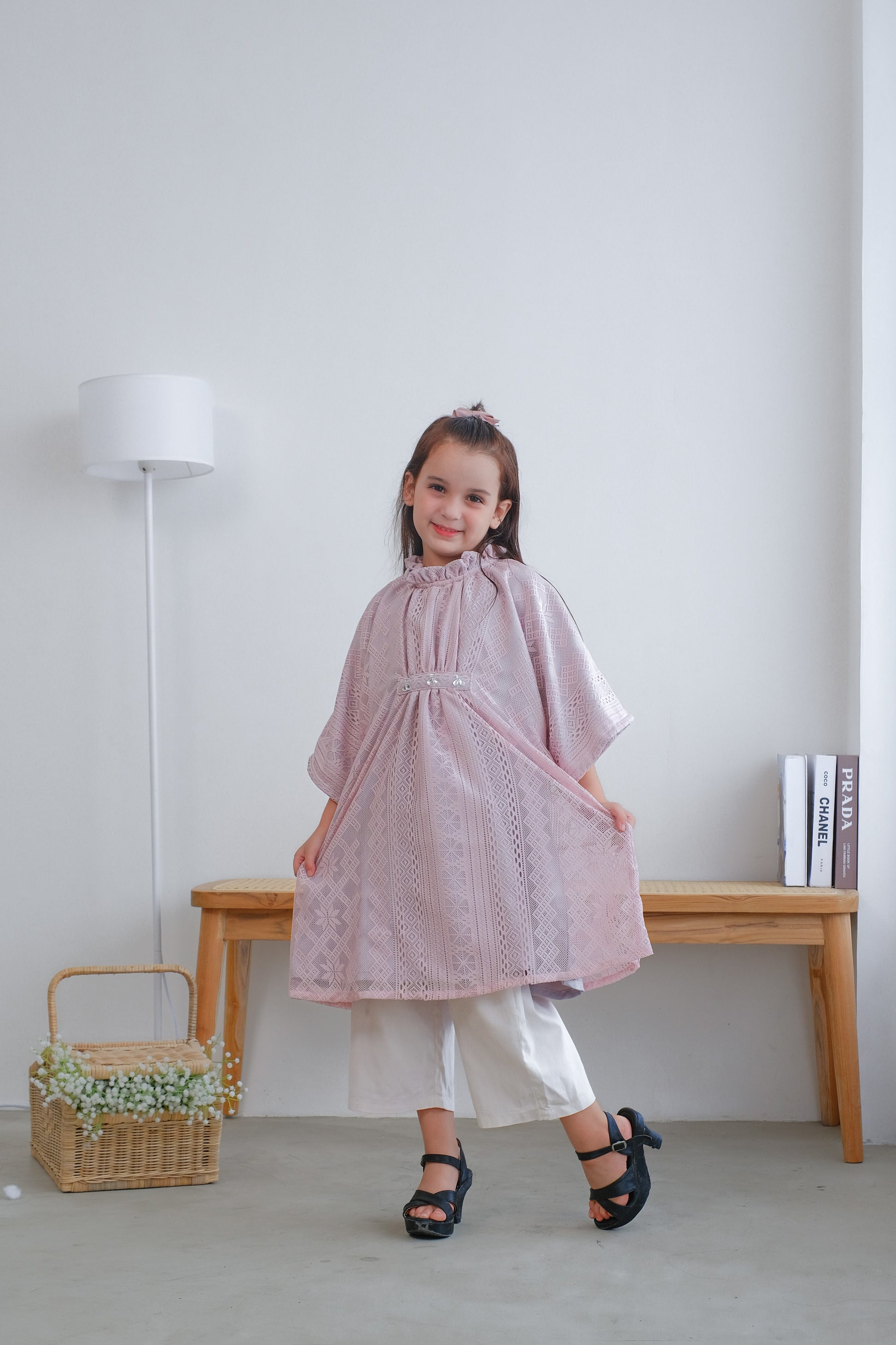 - Atasan kaftan anak perempuan berwarna broken white, dusty pink dan nude pink